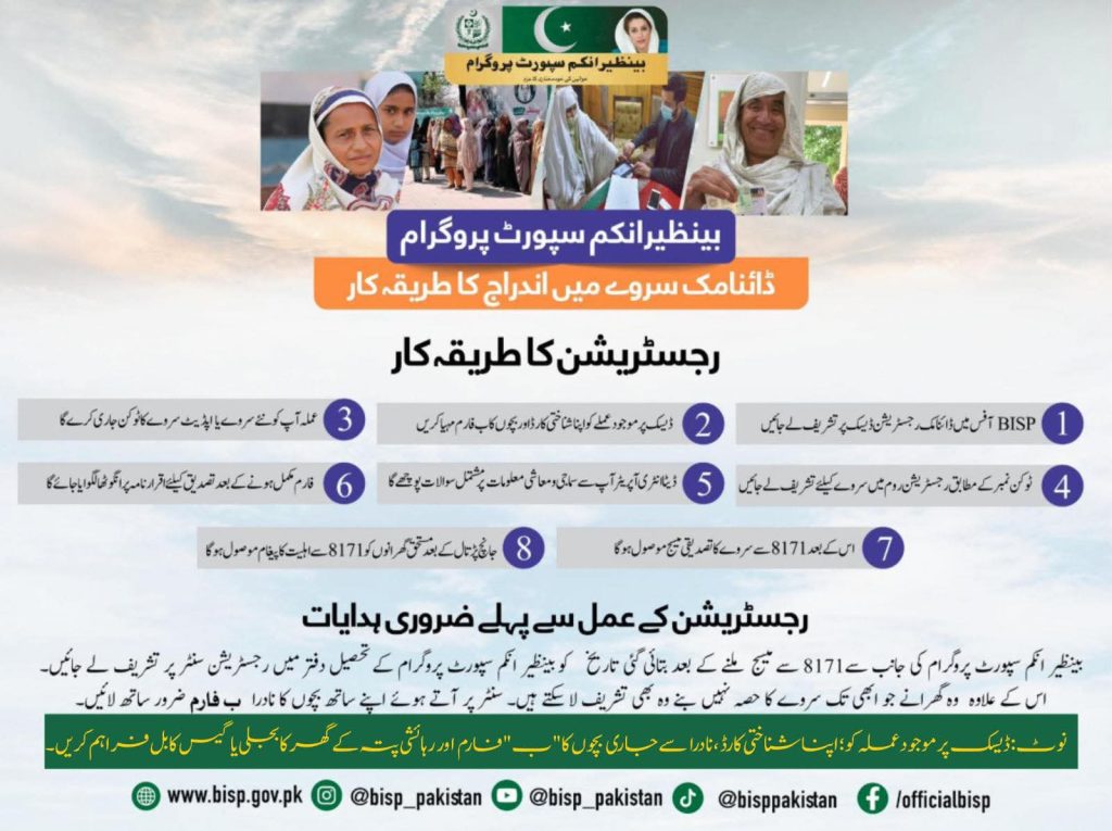 First, visit your nearest BISP Tehsil office. Go to the Dynamic Registration Desk when your area is called or when you receive an SMS from 8171.